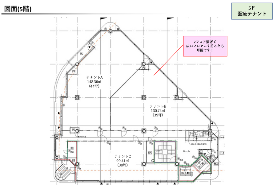 | 募集区画 | テナントA: 44坪 テナントB: 39坪 テナントC: 30坪 |